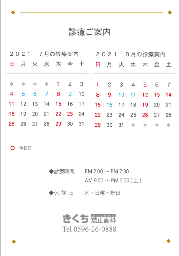 2021.7、8月の診療案内です?