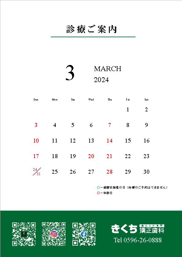 こんにちは🤗2024年3月の診療案内です🦷ご予約の参…