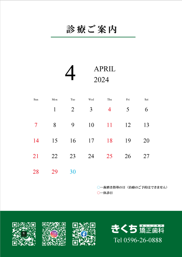 こんにちは😊2024年4月の診療案内です🦷ご予約の参…