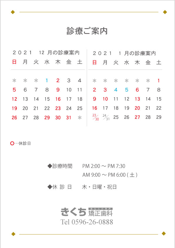 2021.12月、1月の診療案内