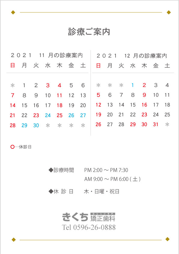 こんにちは?2021.11月、12月の診療案内です?…