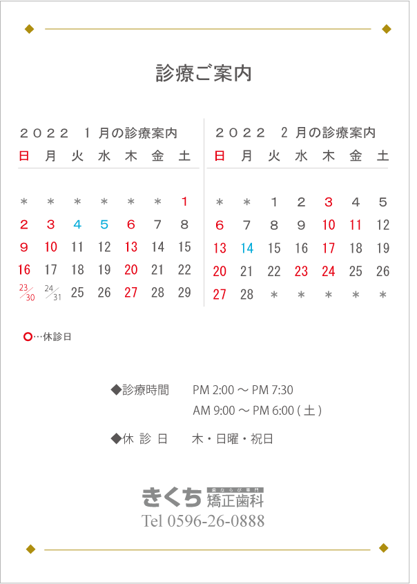 2022年1月、2月の診療案内