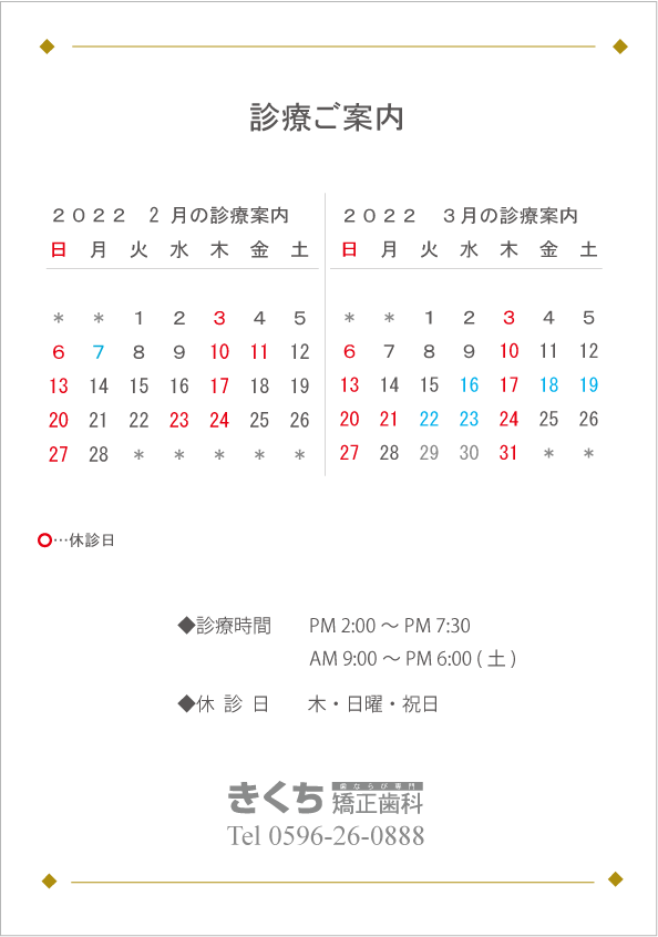 こんにちは?2022年2月、3月の診療案内です!ご予…