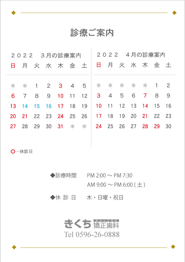 2022年2月、3月の診療案内